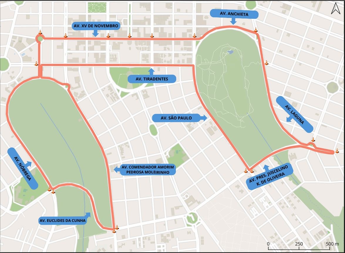 Haverá ainda bloqueios em trechos das avenidas Parigot de Souza, entre a Praça Presidente Kennedy e a Avenida Nóbrega, e XV de Novembro, entre a Praça Kennedy e a Avenida São Paulo. A chegada ocorre no mesmo ponto da largada (confira aqui detalhes do percurso da Prova Rústica Tiradentes).