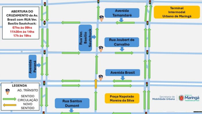 A Prefeitura de Maringá, por meio da Secretaria de Mobilidade Urbana (Semob), informa que o cruzamento da Avenida Brasil com a Rua Vereador Basílio Sautchuk será reaberto de forma permanente a partir desta sexta-feira, 17. A medida faz parte das ações adotadas pela administração municipal para melhorar o fluxo de veículos na área central. A reabertura busca oferecer novas opções de trajeto aos motoristas e reduzir o impacto de interdições no entorno.