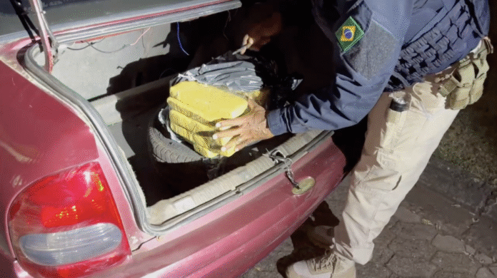 Em vistoria no Corsa os PRFs encontraram 15,7 kg de maconha no porta-malas, além de constatarem que esse automóvel ostentava placas falsas e que foi objeto de furto no dia 27 de março de 2025, em São Paulo.